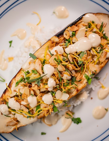 Baked Aubergine, Miso & Peach Yogurt Sauce, crispy garlic & ginger, toasted almonds, coriander, served with rice.