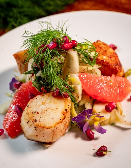 Scallops, Pink Grapefruit marinated Fennel, Pomegranate Seeds